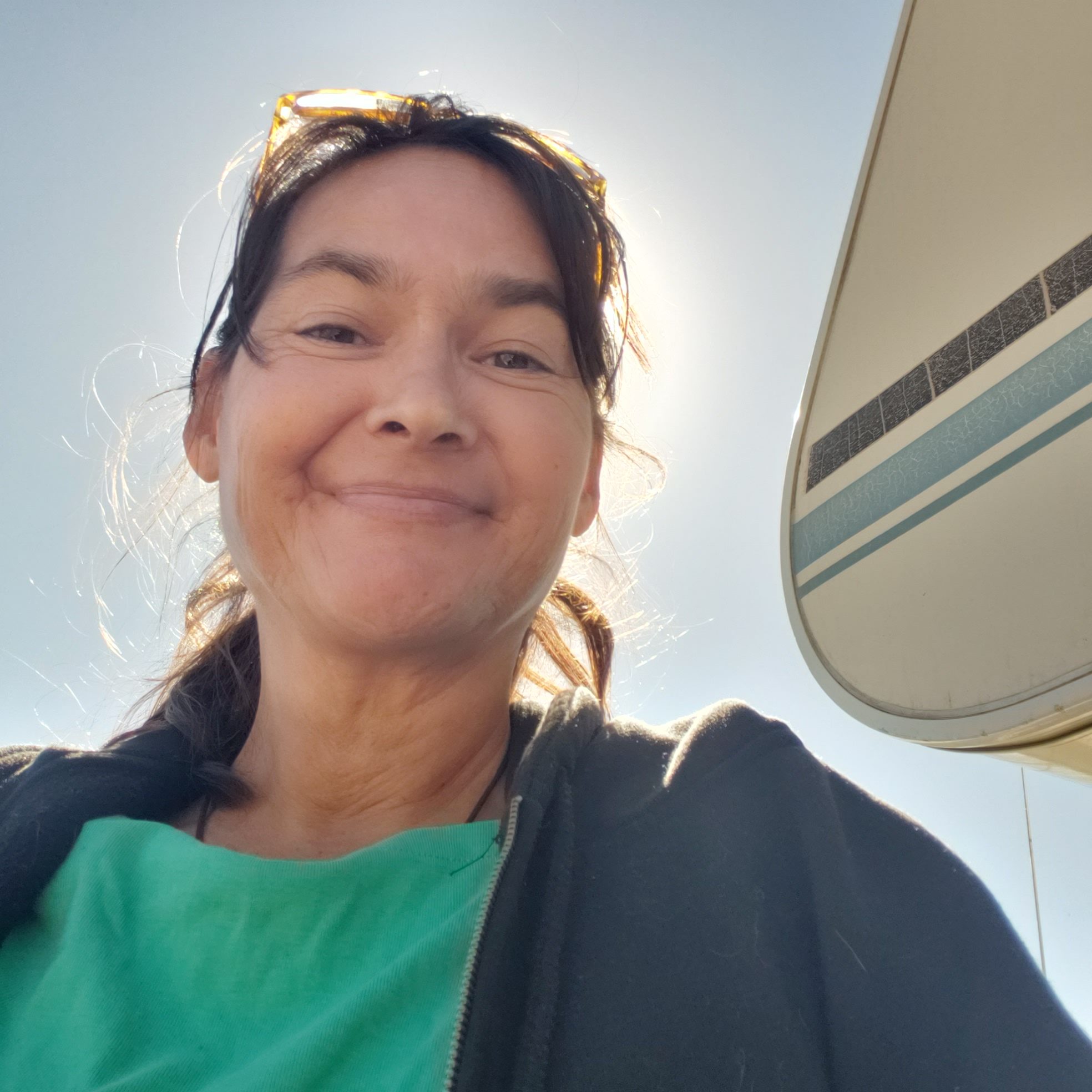 Nikki Lyn Pugh, MFA, INHC (aka The Gentle Healthy Traveler!) next to “Winnie the Pugh” (1993 Winnebago Warrior).